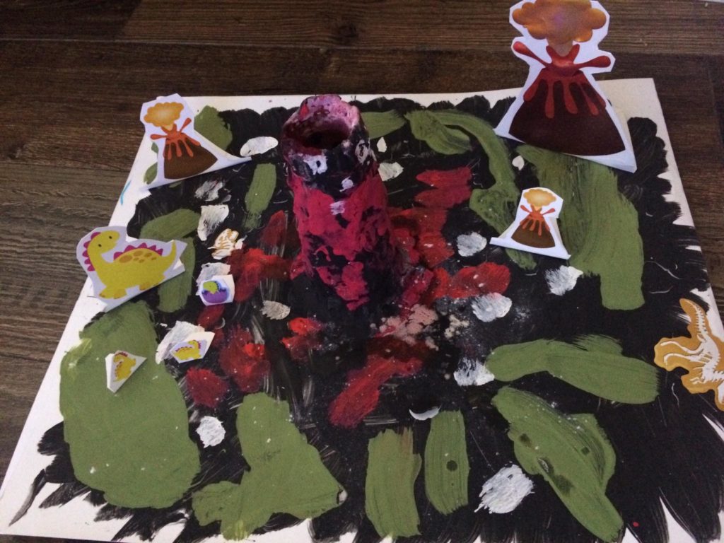 Cuinn (3) made a volcano from his recreate materials, he added clay, paint, and dinosaur stickers and when it was ready they put some baking soda, vinegar and red food dye for the lava!