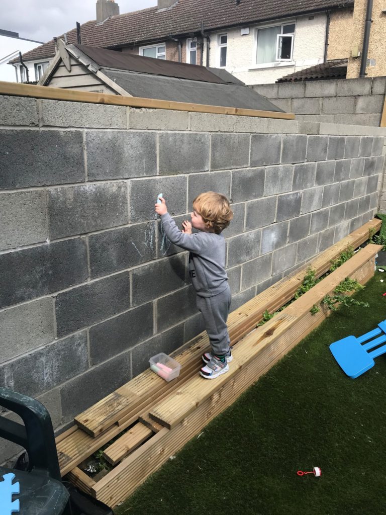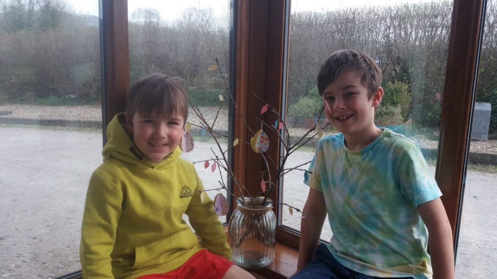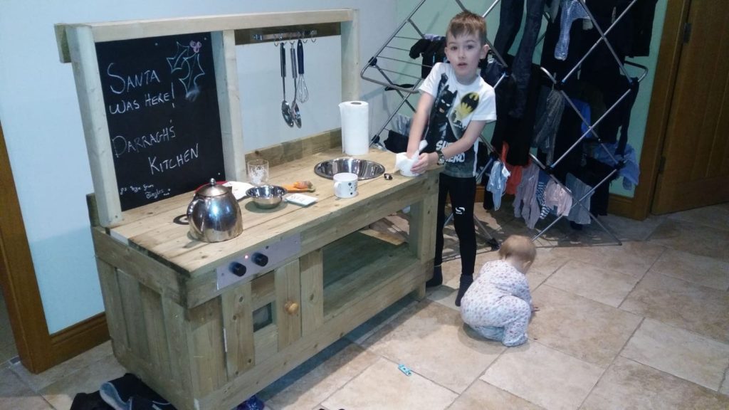 Luca and Darragh are seen here with their Easter Tree. They also made an Easter wreath made from egg cartons. Creativity runs in the Devine family. Mud kitchen made by Santa from paletts but the blueprint came form dad Bosco, who also got creative by making a mini green house made by recycling the old shower.