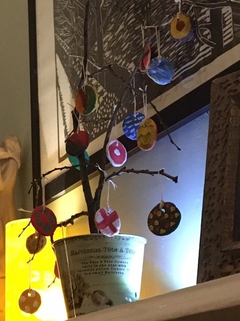 Adam Posavitz is 8 years old and has made an Easter tree, made from rolled dough, baked, painted and placed on branches gathered in the park.