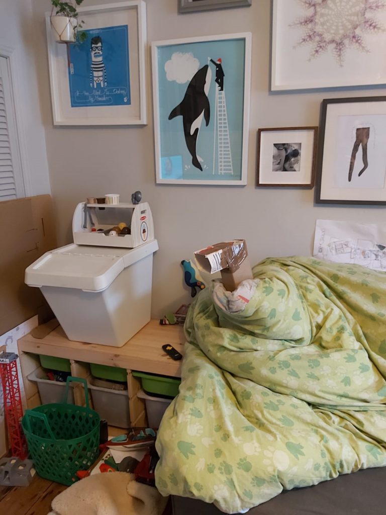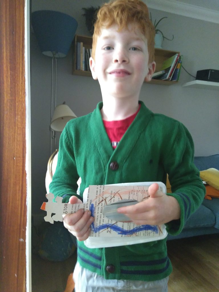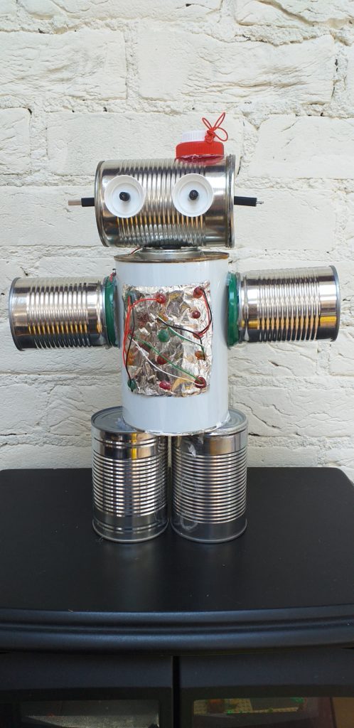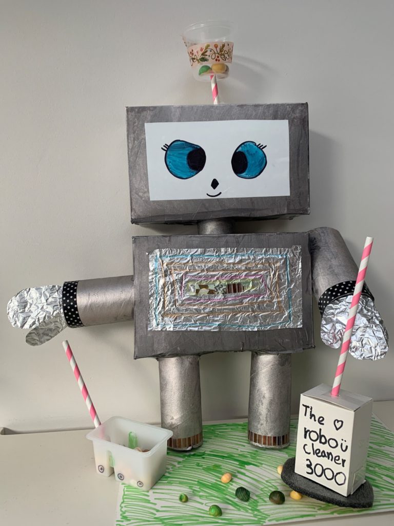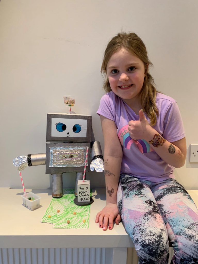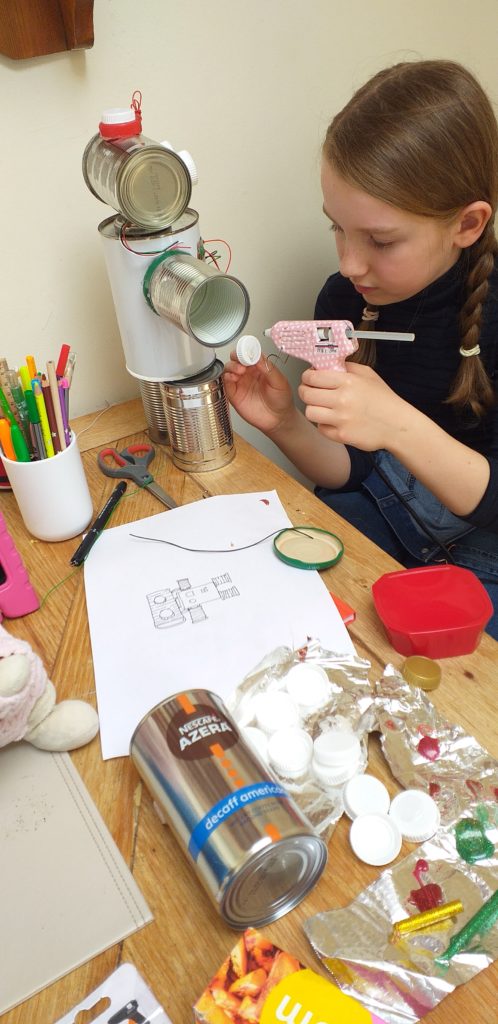 Eimear, aged 10, had great fun rummaging in the recycling and making a robot out of tin cans, a paint tin, lids, foil, an old phone charger, coloured glue sticks and a glue gun! She named it ‘Robot-19’ and we really love it!