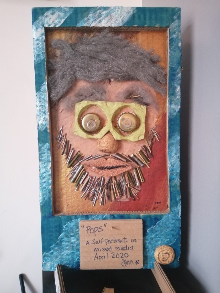 This entry was created by an individual who’s actual age should remain a mystery (60!). Dave made this image in response to not being able to buy a suitable birthday for his Granddaughter. The hair is an Iron wool abrasive, glasses are egg boxes, eyes are bottle lids, pupils are washers, beard is twigs (some painted silver to highlight greys), mouth is sponge all mounted on card… all 4 layers of them and the most ingenious of all the materials - dog hair eyebrows. Such a lovely gift!