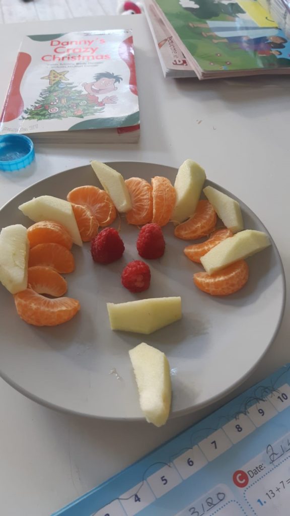 While taking a break from the busy homeschooling, Joey was very inventive and made this really cool face with his lunch 🙂 He has also been really busy buidling a lego football game with his brother Bobby and sister Emma! Well done Joey & co!
