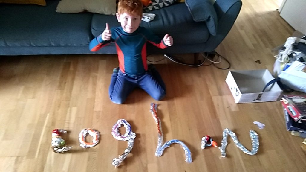 Eoghan has been inspired by our Creative Corner videos while staying at home and has made a couple different creations 🙂 He’s made a cool design of his name from Episodes 2 & 3 of our videos and also made a Guitar from our recent musical instrument episodes. Well done Eoghan!